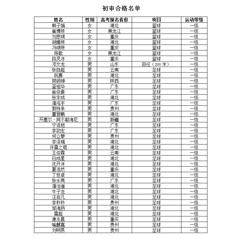 根据《武汉科技大学2019年高水平运动队招生简章》,我校组织了高水平运动队招生报名工作。经资格审查,下列考生通过初审,现予以公示(公示期为5天),如有异议可通过以下渠道向我校进行反映:(027)86530789(招生办公室)、(027)68862473(监察处)。