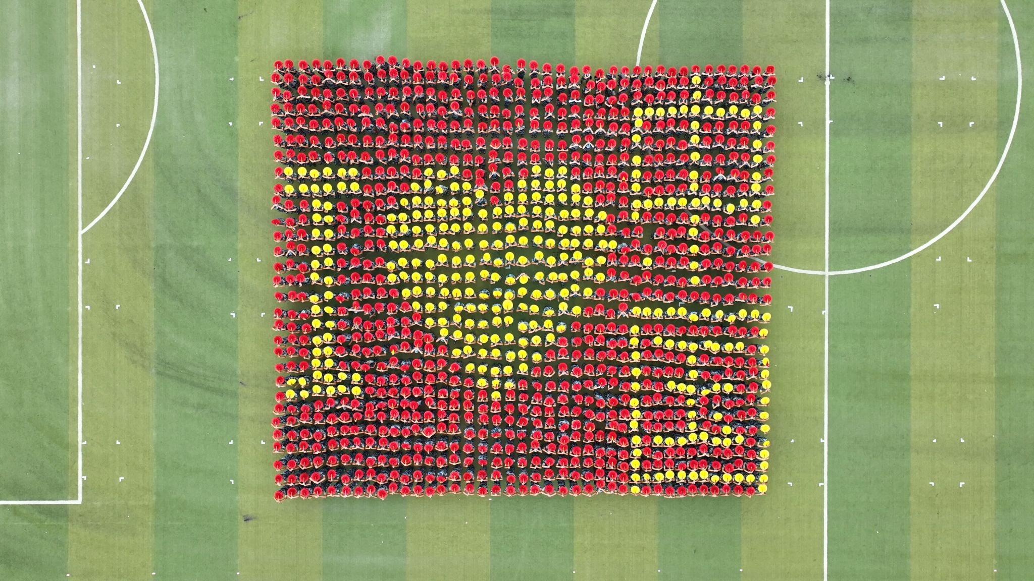 “正义必胜!和平必胜!人民必胜!”嘹亮口号响彻运动场,由1200名新生组成的 “爱国荣校”方阵率先登场。方阵成员以鼓点为令、协同联动,手中红黄双色圆扇迅速变换,先后呈现“我爱中国”字样与党徽图案,画面恢宏、寓意深刻,展现出青年学子的家国情怀。