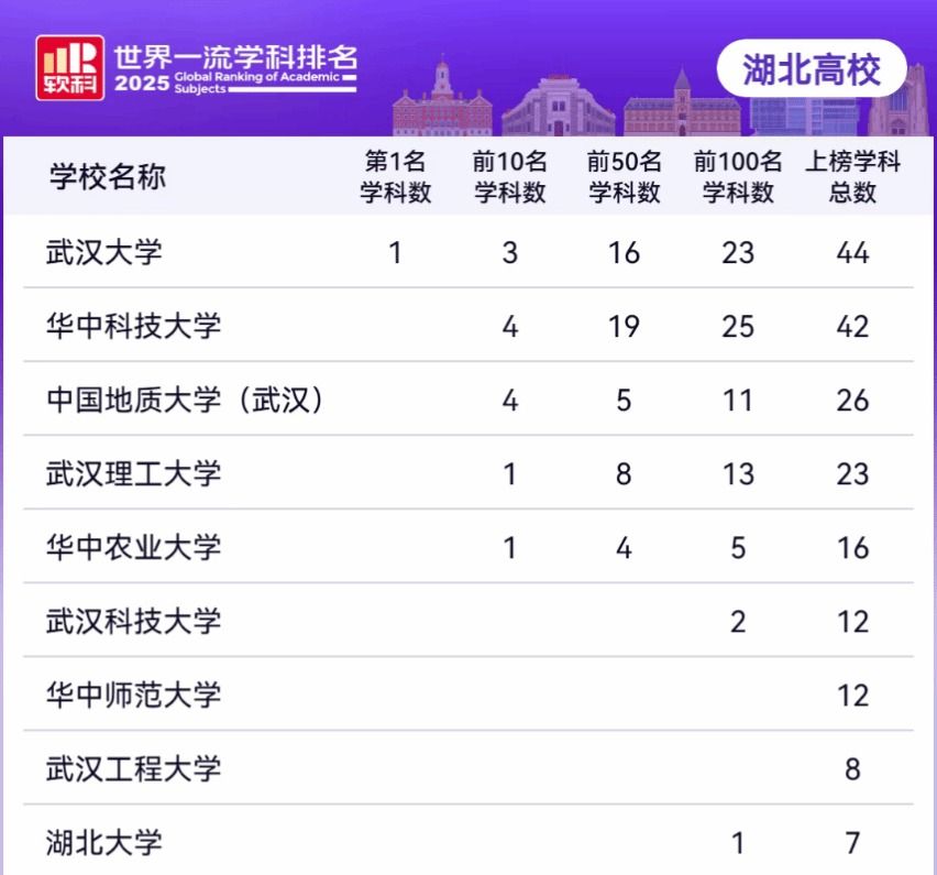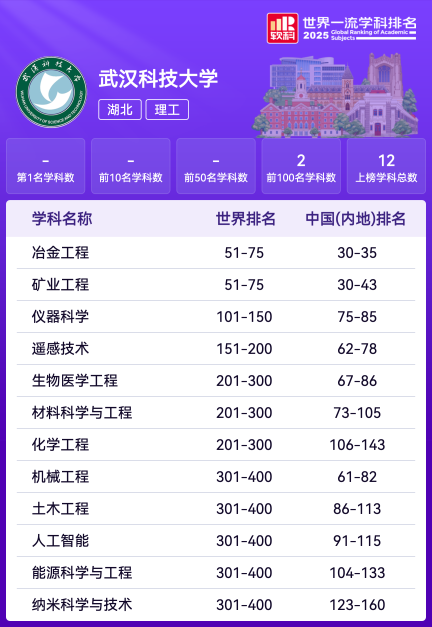 武科大网讯 11月18日,软科发布“2025世界一流学科排名”,我校12个学科上榜,位居湖北省属高校第一。近六年来,在软科世界一流学科排名中,我校始终保持湖北省属高校上榜学科总数最多,排名第一。