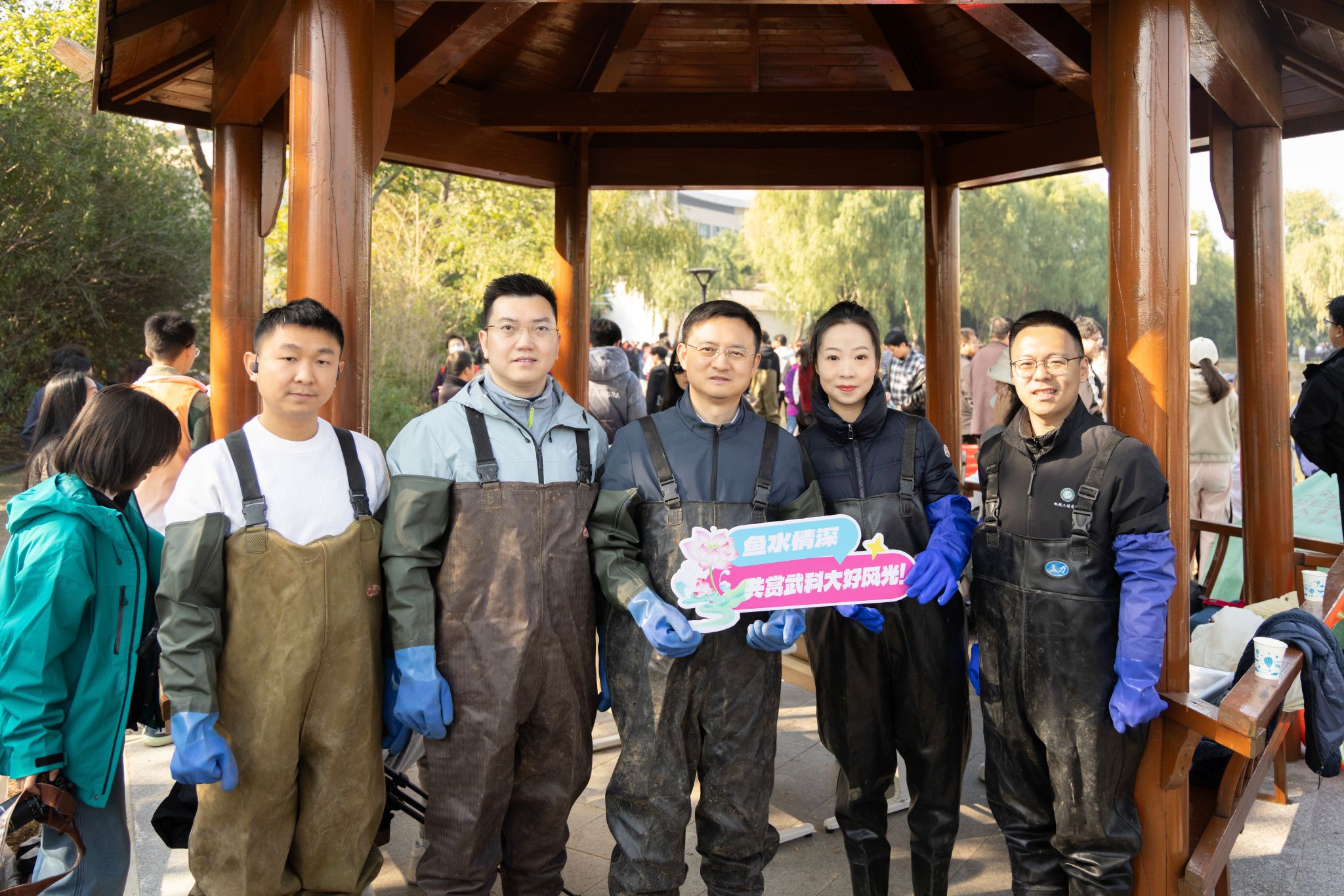 与往年不同,今年的捕鱼队伍中首次出现了校友和教师的身影,为这场“渔”乐盛宴增添了浓浓温情与传承之意。“往年都在岸上当观众,今年我也要亲自下场,和同学们并肩作战!”机械学院辅导员章健宇,本硕皆就读于本校,已连续十年参加鱼宴,今年他笑着穿上下水裤,与学生们一同走进湖中。化工学院2000级校友宋合兴更是难掩激动:“毕业二十余载,今天代表25万校友回家,希望能捕上一条大鱼,为母校庆生!”