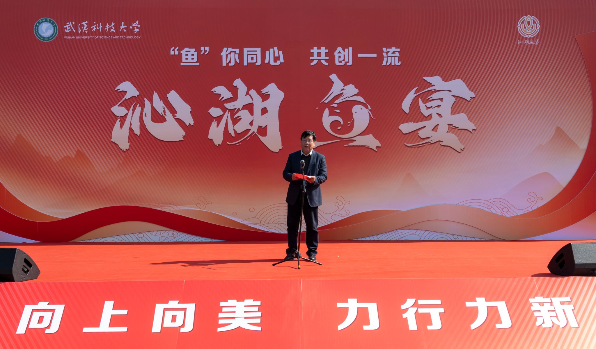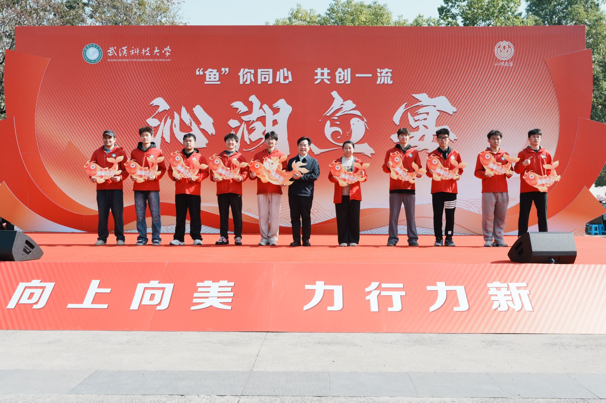 上午十一点半,南园餐厅广场已是人潮涌动,香气弥漫。校长吕勇宣布第十一届沁湖鱼宴开幕,并为“捕鱼王”颁奖。校党委副书记沈季伟在开幕式上致辞,他表示,今年的鱼宴以“鱼你同心 共创一流”为主题,这既是文化传承的基因密码,也是全体武科大人勇攀一流高峰的共同追求。他祝愿大家“年年有鱼,岁岁欢歌!”